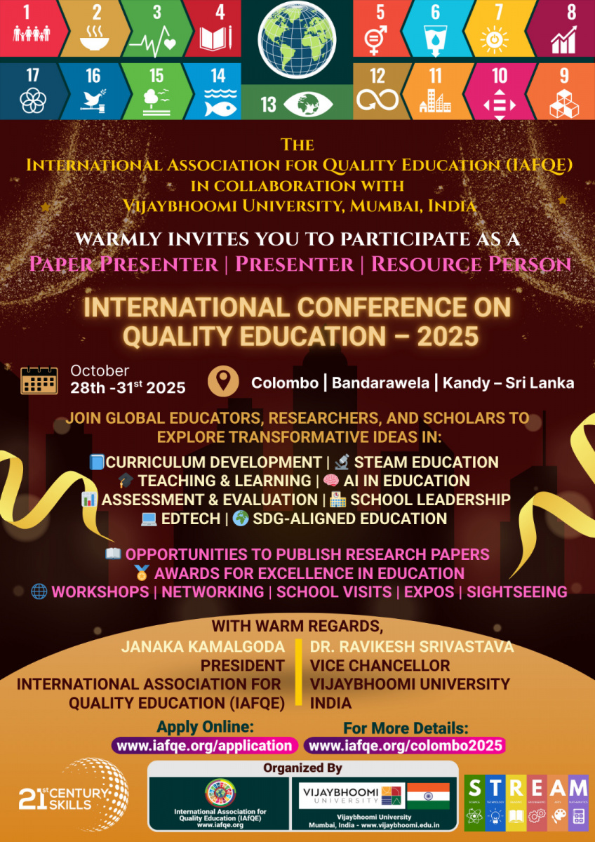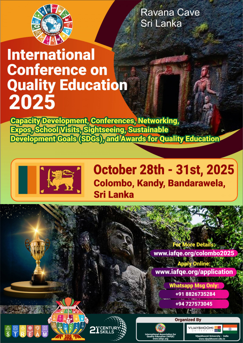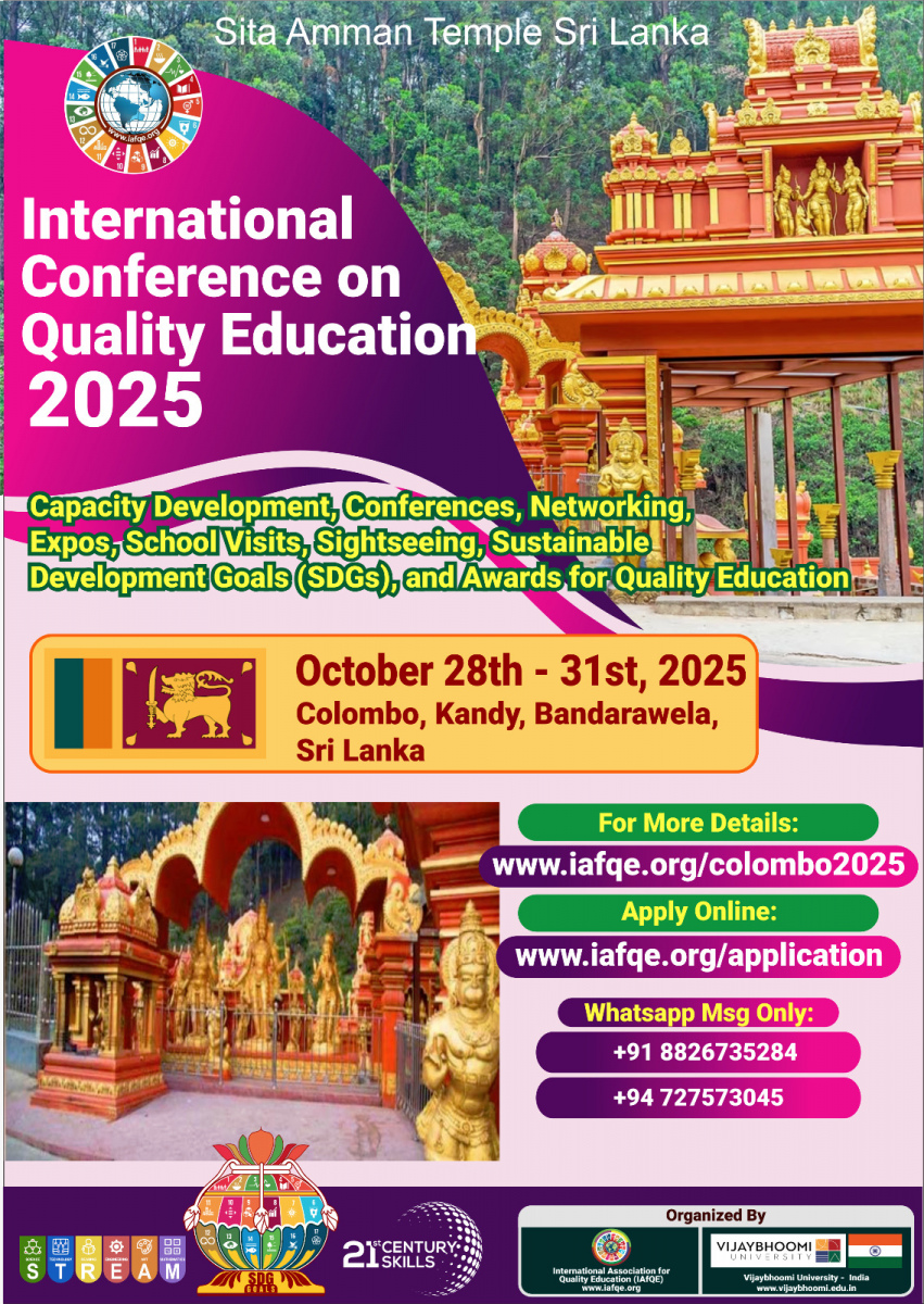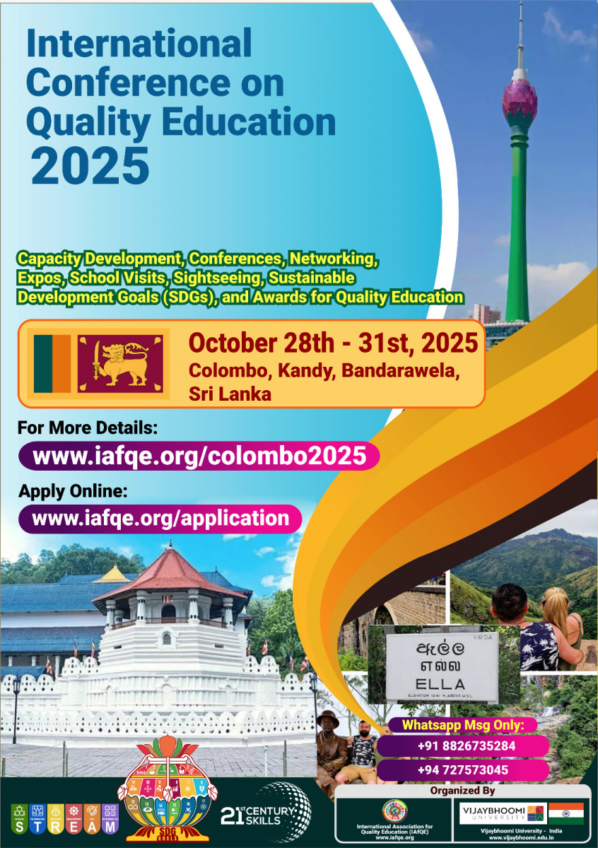 The International Conference on Quality Education 2025 will take place from October 28th – 31st, 2025 in Colombo, Bandarawela, Kandy, Sri Lanka. The event will bring together global leaders in education, school owners, principals, educators, teachers, and distinguished VIPs from various countries.