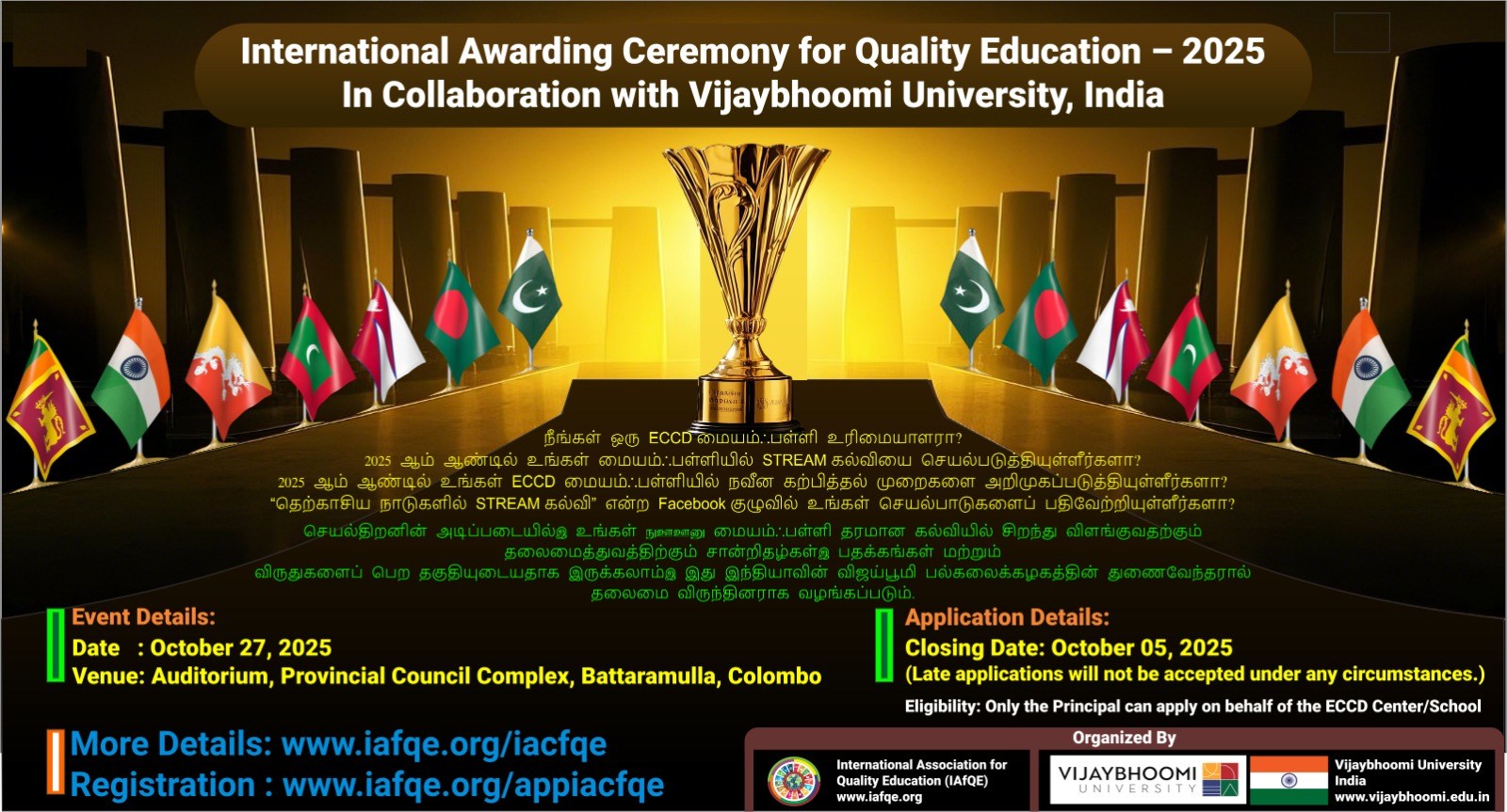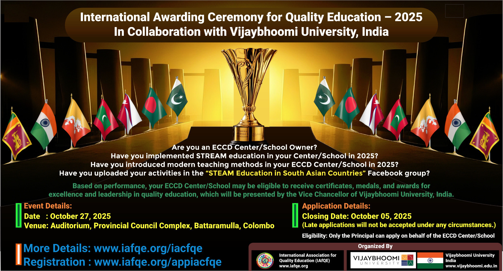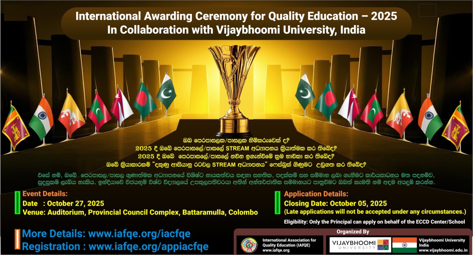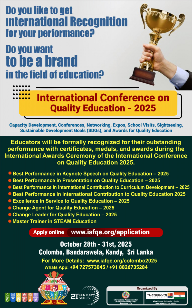 The International Conference on Quality Education 2025 will take place from October 28th – 31st, 2025 in Colombo, Bandarawela, Kandy, Sri Lanka. The event will bring together global leaders in education, school owners, principals, educators, teachers, and distinguished VIPs from various countries.