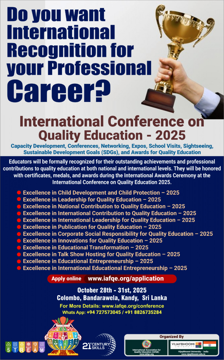 The International Awarding Ceremony for Quality Education – 2025 is a flagship initiative aimed at recognizing and celebrating exceptional contributions by educators, institutions, and education leaders who are advancing the quality of education through STEAM integration, research-driven practices, and child-centered teaching methodologies.